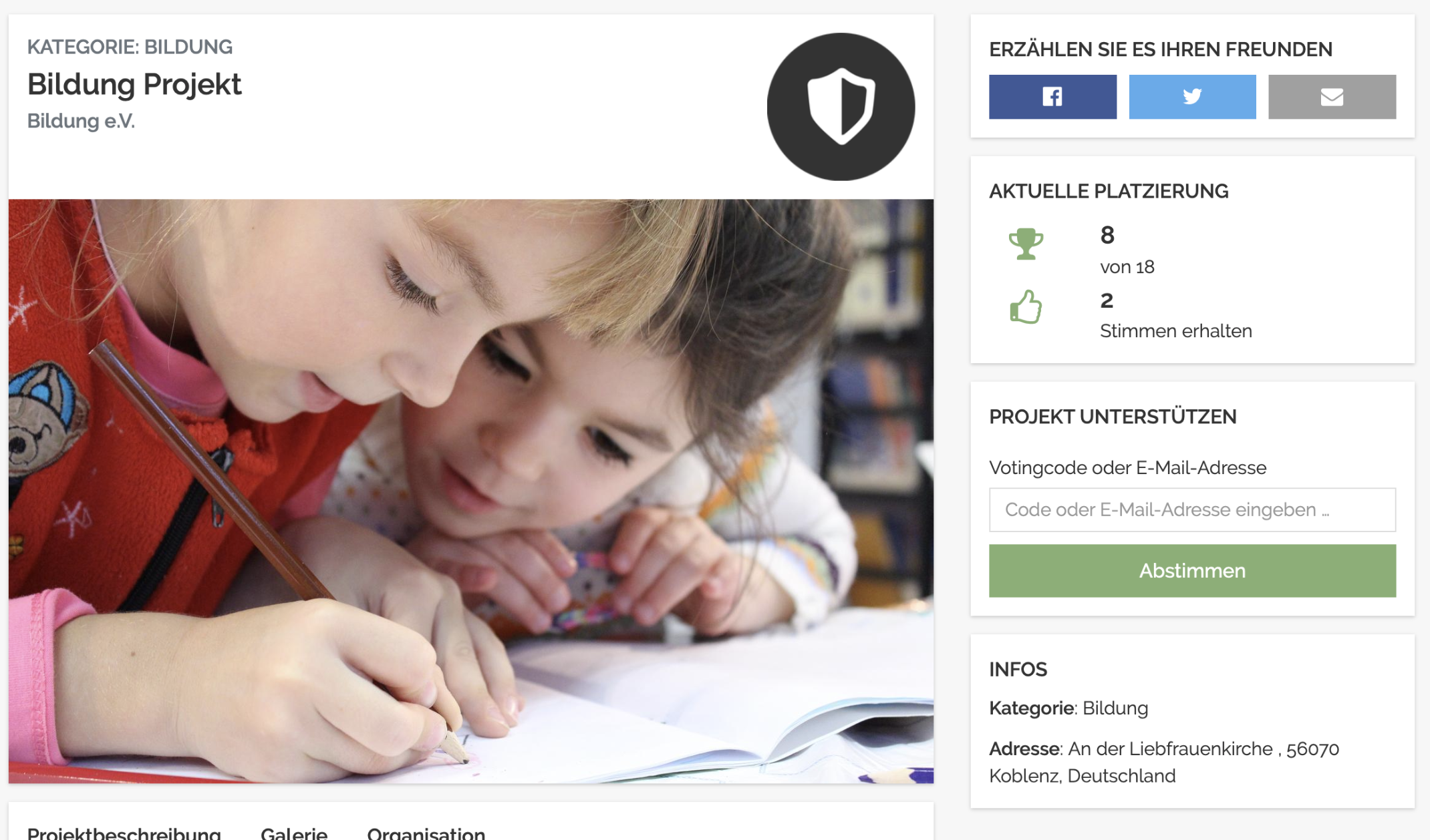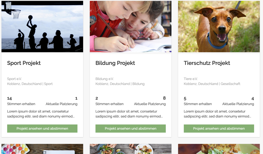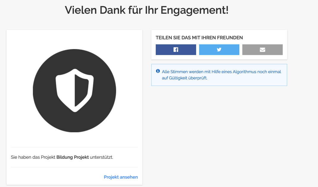 Such dir ein Projekt von der Projektübersichtsseite aus, das du mit deiner Stimme unterstützen möchtest. Klicke dazu auf den Button „Projekt ansehen und abstimmen". Damit gelangst du auf die Detailseite des Projekts.