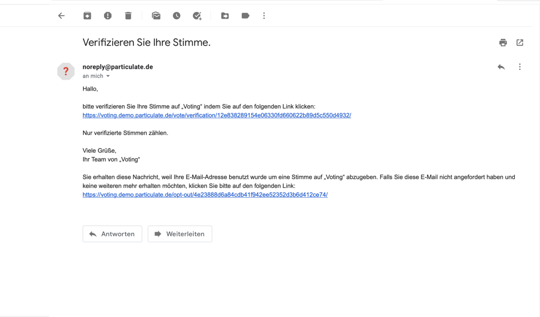 Du erhältst eine E-Mail mit einem Bestätigungslink an die eben eingegebene E-Mail-Adresse. Damit deine Stimme gezählt wird, musst du auf den Bestätigungs-Link in der E-Mail klicken. Sollte der Link nicht klickbar sein, kopiere diesen vollständig und füge ihn in die Adresszeile deines Internet-Browsers ein.